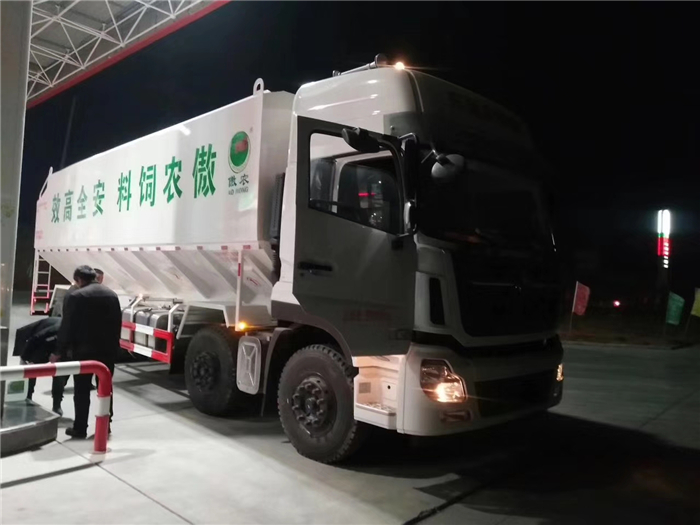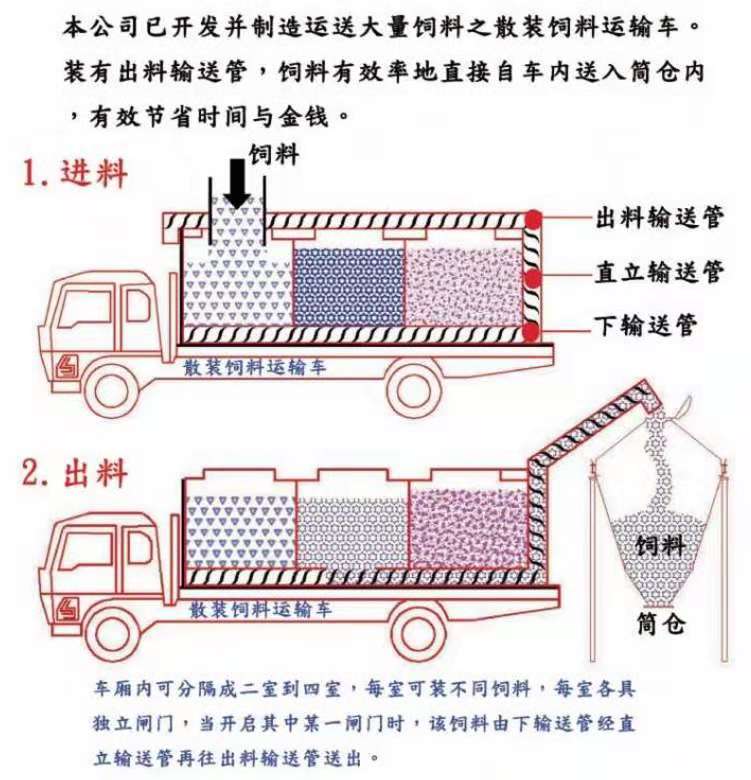 散裝飼料車的優(yōu)勢: 散裝飼料的生產可實現(xiàn)直接生產直接裝車,隨產隨出,不需要進行提前備貨,不占用倉儲設施,也不會出現(xiàn)停產等待拉料的現(xiàn)象,使飼料生產實現(xiàn)計劃管理,生產效率得到提升。 ★獨有倒梯形設計,散裝飼料在罐體內密封輸送,V字形罐體卸料順暢,減少飼料的耗損,保證質量,避免污染。 ★運輸比包裝成袋運輸不但節(jié)省勞動力,而且成本較低。 ★可選電動卸料、全液壓卸料、氣卸為全自動上料卸料,可連續(xù)作業(yè),大大提高生產效率。 ★罐體內可加裝分倉,可同時運輸多種不同類的飼料或膨人介質。部件標準化,容易維修保養(yǎng)。 頂部進料倉