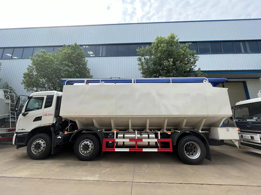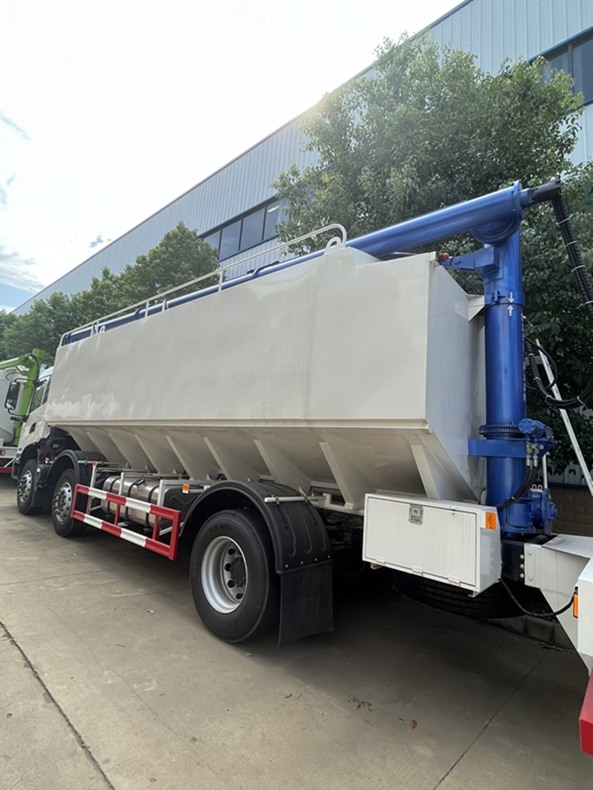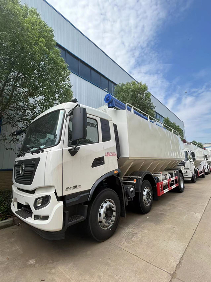 散裝飼料運(yùn)輸車(chē),散裝飼料車(chē)的飼料罐架設(shè)在卡車(chē)的底盤(pán)上,罐頂開(kāi)有進(jìn)料口.頂部的一根螺旋輸送卸料管(俗稱(chēng)卸料絞龍)則可自由回轉(zhuǎn)和抬升,抬升的仰角可達(dá)60度。運(yùn)輸時(shí),頂部的螺旋管平臥在罐頂;卸料時(shí)則抬起,使管端的出料口與畜禽飼養(yǎng)場(chǎng)貯料罐頂部的進(jìn)料門(mén)相接,駕駛室內(nèi)裝有操縱裝置(操縱裝置也可裝置在罐體尾部),卸料時(shí)通過(guò)車(chē)底的動(dòng)力輸出軸和減速器來(lái)驅(qū)動(dòng)螺旋,以完成卸料。