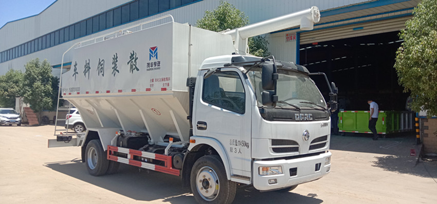 散裝飼料運輸車,散裝飼料車的飼料罐架設(shè)在卡車的底盤上,罐頂開有進(jìn)料口.頂部的一根螺旋輸送卸料管(俗稱卸料絞龍)則可自由回轉(zhuǎn)和抬升,抬升的仰角可達(dá)60度。運輸時,頂部的螺旋管平臥在罐頂;卸料時則抬起,使管端的出料口與畜禽飼養(yǎng)場貯料罐頂部的進(jìn)料門相接,駕駛室內(nèi)裝有操縱裝置(操縱裝置也可裝置在罐體尾部),卸料時通過車底的動力輸出軸和減速器來驅(qū)動螺旋,以完成卸料。