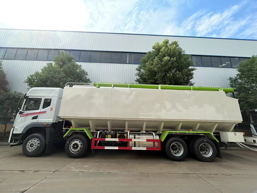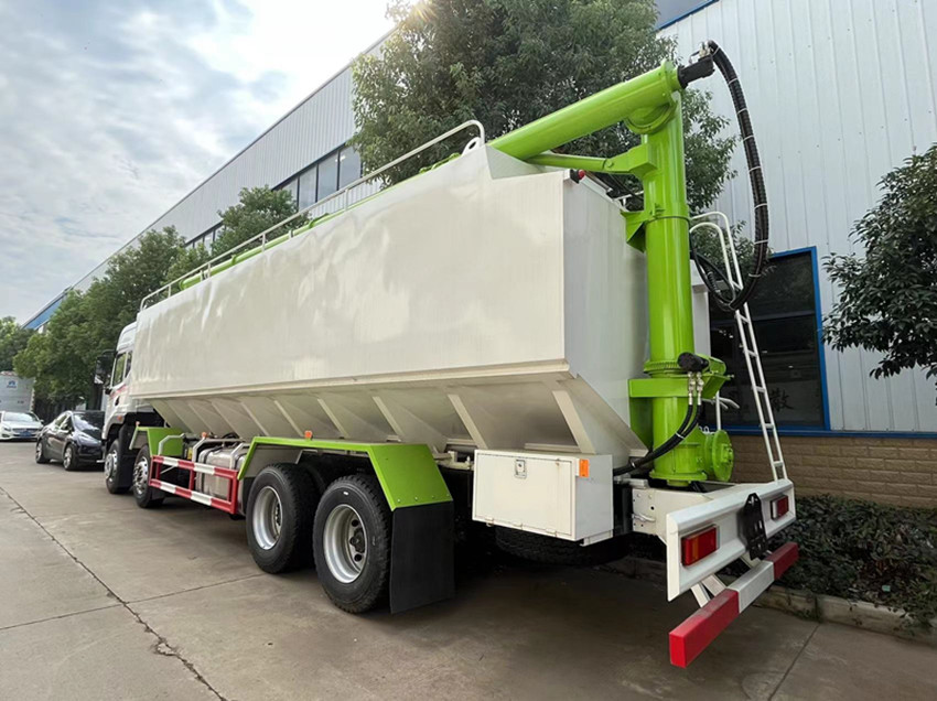 散裝飼料運(yùn)輸車(chē),散裝飼料車(chē)的飼料罐架設(shè)在卡車(chē)的底盤(pán)上,罐頂開(kāi)有進(jìn)料口.頂部的一根螺旋輸送卸料管(俗稱(chēng)卸料絞龍)則可自由回轉(zhuǎn)和抬升,抬升的仰角可達(dá)60度。運(yùn)輸時(shí),頂部的螺旋管平臥在罐頂;卸料時(shí)則抬起,使管端的出料口與畜禽飼養(yǎng)場(chǎng)貯料罐頂部的進(jìn)料門(mén)相接,駕駛室內(nèi)裝有操縱裝置(操縱裝置也可裝置在罐體尾部),卸料時(shí)通過(guò)車(chē)底的動(dòng)力輸出軸和減速器來(lái)驅(qū)動(dòng)螺旋,以完成卸料。